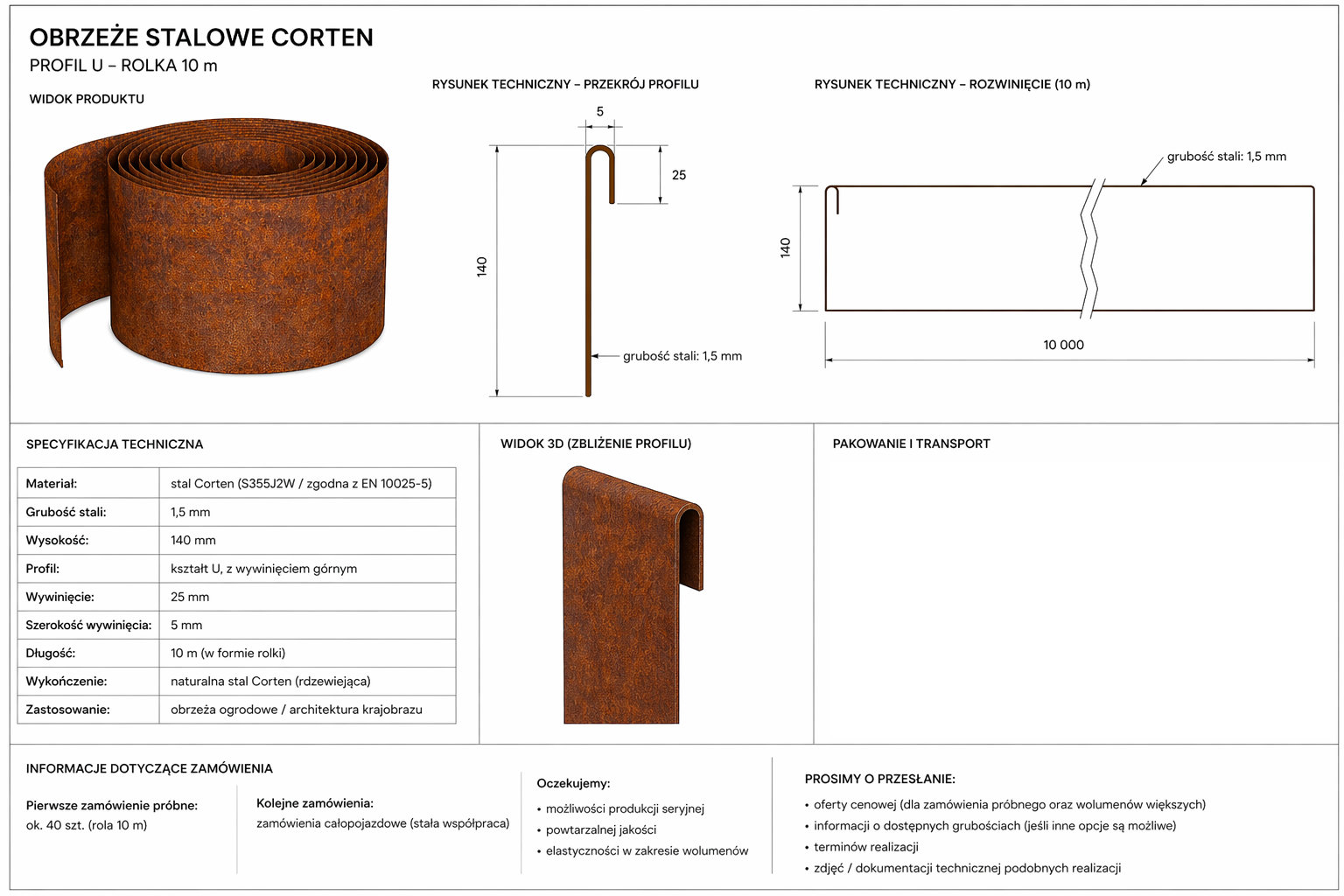 Przedmiotem zapytania jest produkt w formie zwiniętej taśmy stalowej o długości 10 mb, wykonanej z blachy Corten, profilowanej w kształt zbliżony do U” zgodnie z załączonym rysunkiem technicznym: link do pliku .