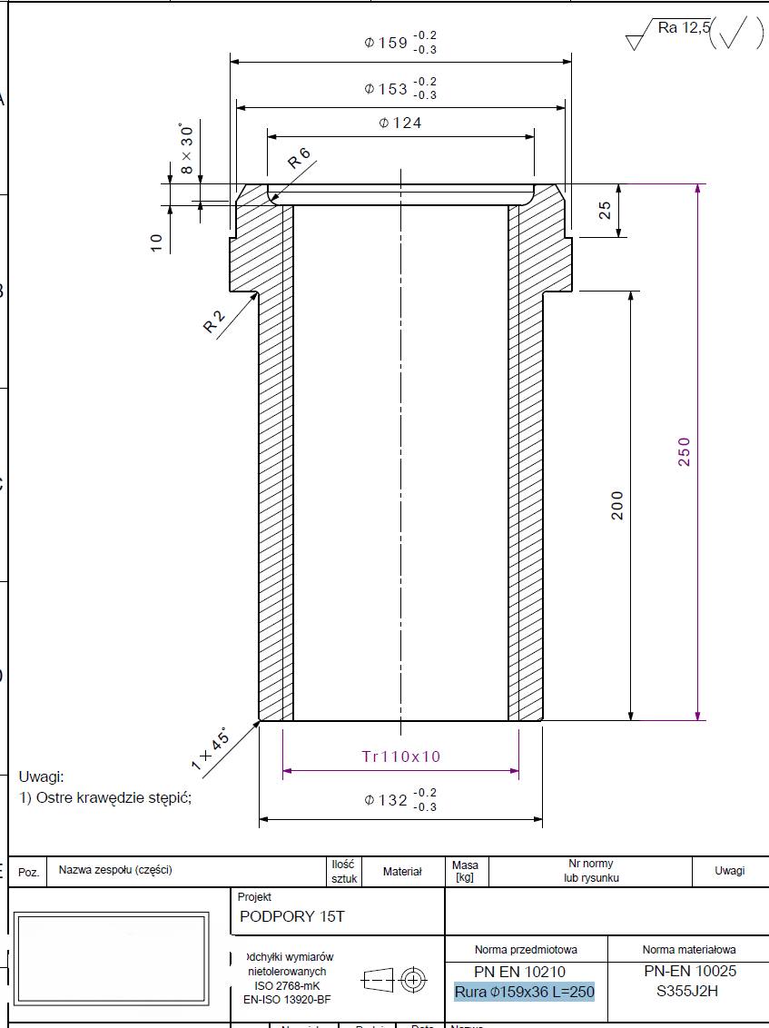 Zlecę wykonanie detali z rury fi 159x36 długość 253. Interesuje nas usługa wykonania całości wg rysunku: link do pliku . Ewentualnie tylko gwintowanie TR110x10 obrobionego detalu. Ilość 70 sztuk. Dostawa może być sukcesywna od przyszłego tygodnia.